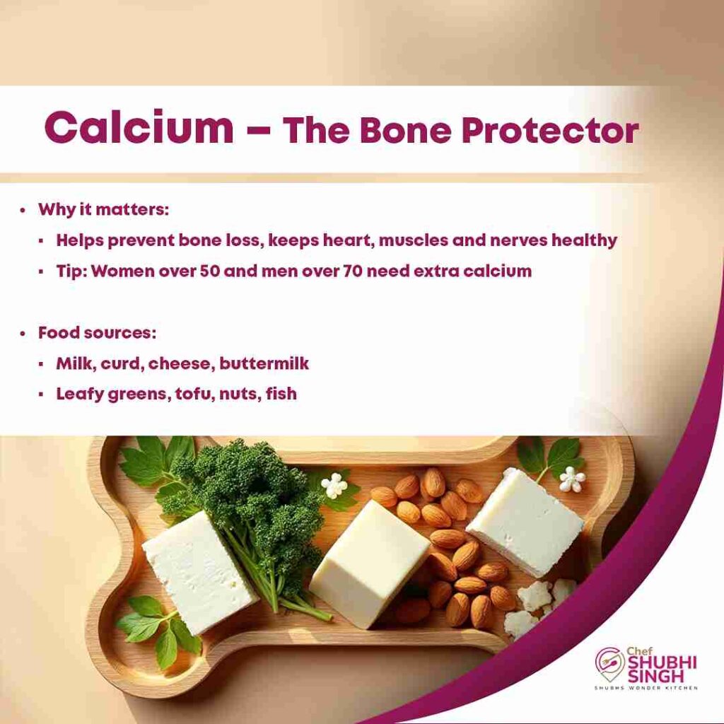 When we are older, our bodies tend to lose more calcium than they absorb, thereby increasing the risk of osteoporosis, especially in women after menopause. This mineral plays a pivotal role in strengthening bones, regulating muscle and heart functioning, transmission of messages in the nervous system and enzyme function. Women over 50 and men over 70 should make it a point to consume about 20% more calcium than other adults.