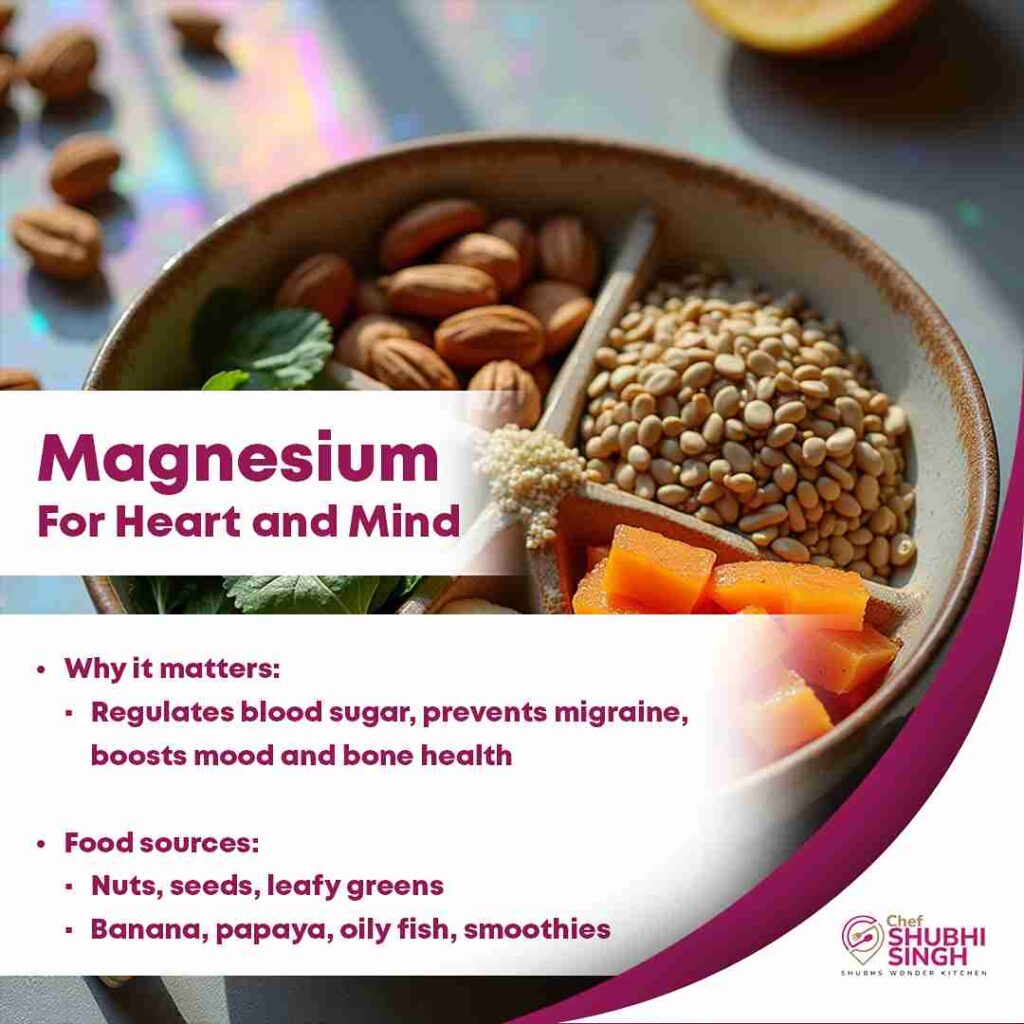 Good dietary sources: A variety of foods like nuts, seeds and leafy greens provide you with a healthy intake of magnesium. Also make sure to add oily fish, bananas, papaya, dried fruits and smoothies with chia seeds or green leaves to your diet.