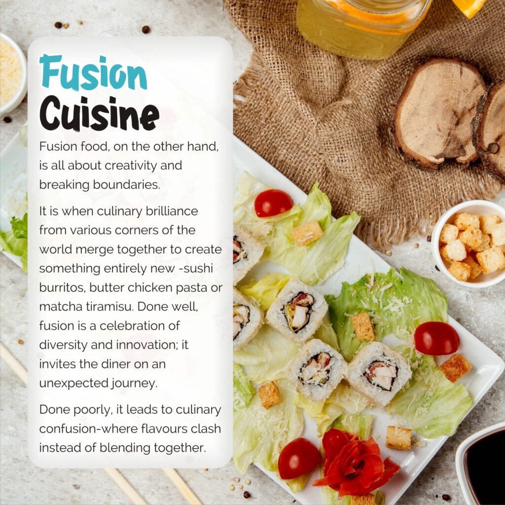 Fusion food, on the other hand, is all about creativity and breaking boundaries. It is when culinary brilliance from various corners of the world merge together to create something entirely new — sushi burritos, butter chicken pasta or matcha tiramisu. Done well, fusion is a celebration of diversity and innovation; it invites the diner on an unexpected journey. Done poorly, it leads to culinary confusion — where flavours clash instead of blending together.