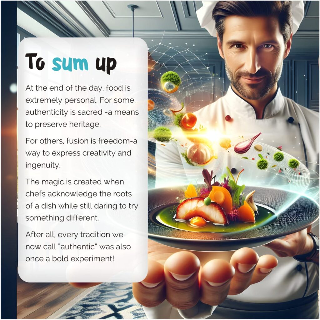 At the end of the day, food is extremely personal. For some, authenticity is sacred — a means to preserve heritage. For others, fusion is freedom — a way to express creativity and ingenuity. The magic is created when chefs acknowledge the roots of a dish while still daring to try something different. After all, every tradition we now call “authentic” was also once a bold experiment!