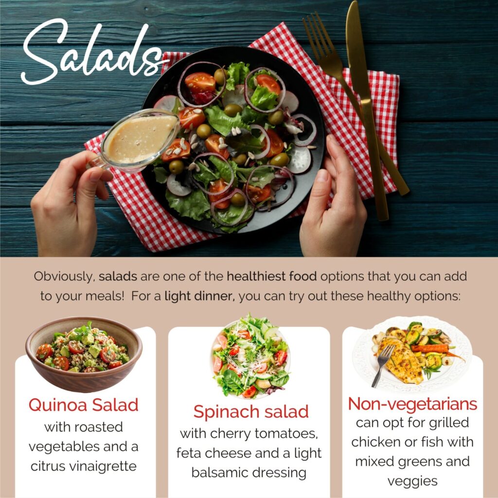 Obviously, salads are one of the healthiest food options that you can add to your meals! For a light dinner, you can try out these healthy options: