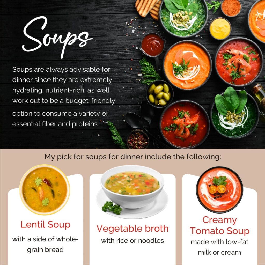 Soups are always advisable for dinner since they are extremely hydrating, nutrient-rich, as well work out to be a budget-friendly option to consume a variety of essential fiber and proteins. My pick for soups for dinner include the following: