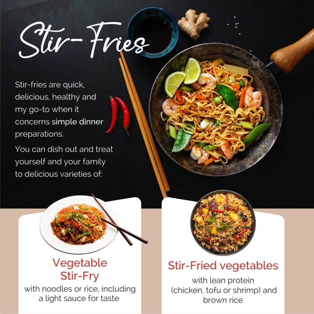 Stir-fries are quick, delicious, healthy and my go-to when it concerns simple dinner preparations. You can dish out and treat yourself and your family to delicious varieties of:
