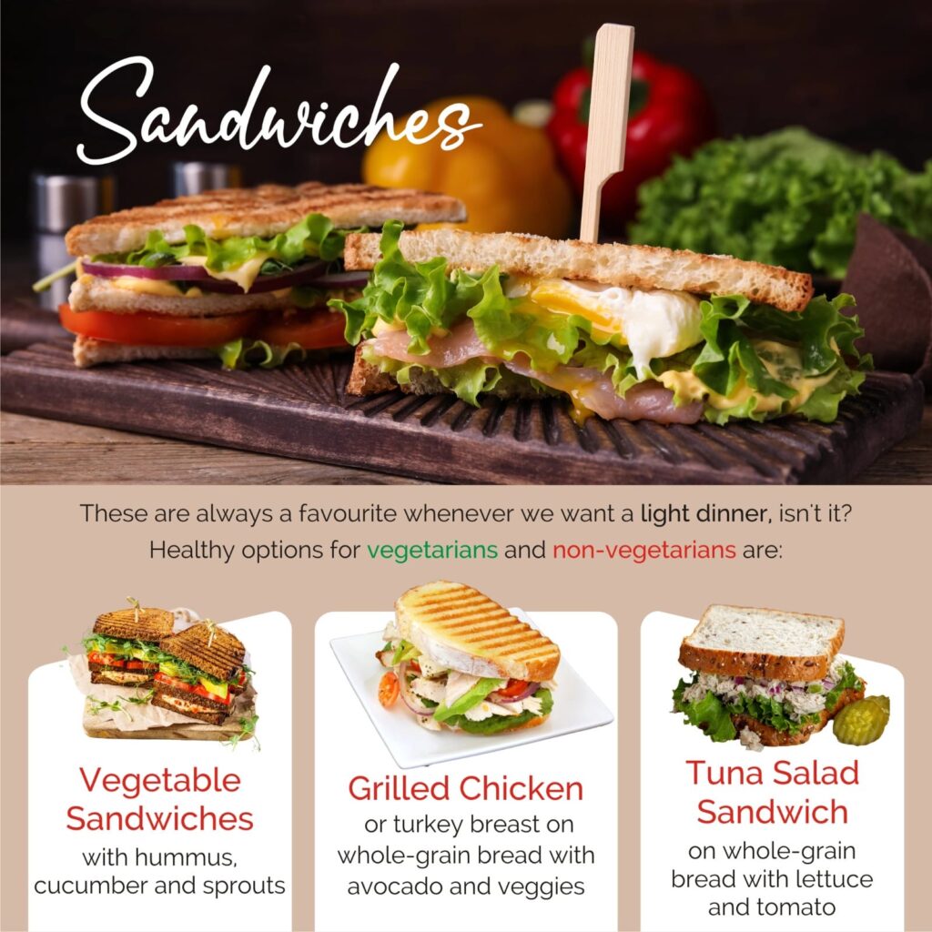 These are always a favourite whenever we want a light dinner, isn’t it? Healthy options for vegetarians and non-vegetarians are: