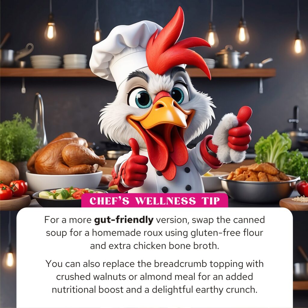 For a more gut-friendly version, swap the canned soup for a homemade roux using gluten-free flour and extra chicken bone broth. You can also replace the breadcrumb topping with crushed walnuts or almond meal for an added nutritional boost and a delightful earthy crunch.