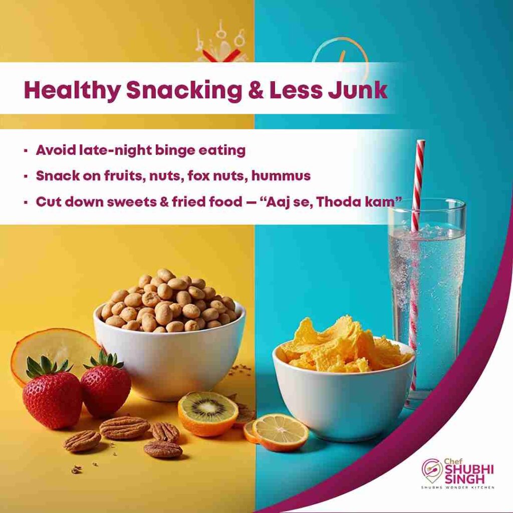 We all have food cravings at unusual hours, don’t we? However, it is important for us to follow the adage: ‘Eat when you are hungry and not when you are bored’. Very often, we tend to gorge on unhealthy snacks like chips, fries and chocolates to satiate our hunger pangs. This junk food does more harm than good to our body. If at all we feel like munching at odd hours, opt for healthier snack options like fruits, fox nuts, almonds, hummus and granola bars.