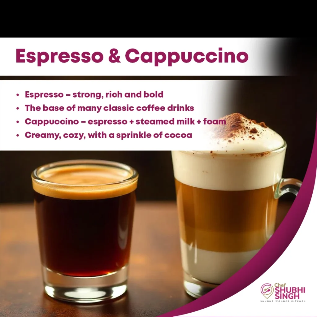 The popular cappuccino consists of equal parts of espresso, steamed milk and milk foam. It is usually served in a small cup and is recognized for its creamy texture and rich flavour. Often, cappuccinos are garnished with a sprinkle of cocoa powder or cinnamon to enhance their taste.