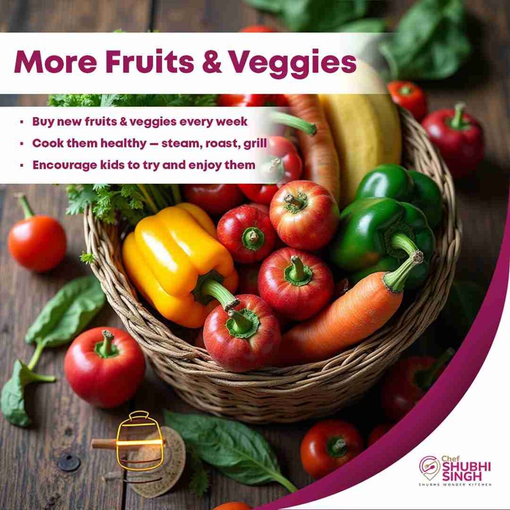 - Include more fruits and veggies: Purchase new varieties of fruits and vegetables every week and cook them in a healthy way. Make your children eat these too to not only provide them with the necessary exposure to these but also to encourage their overall well-being.