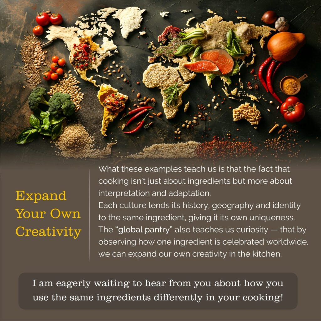 What these examples teach us is that the fact that cooking isn’t just about ingredients but more about interpretation and adaptation. Each culture lends its history, geography and identity to the same ingredient, giving it its own uniqueness. The “global pantry” also teaches us curiosity — that by observing how one ingredient is celebrated worldwide, we can expand our own creativity in the kitchen.