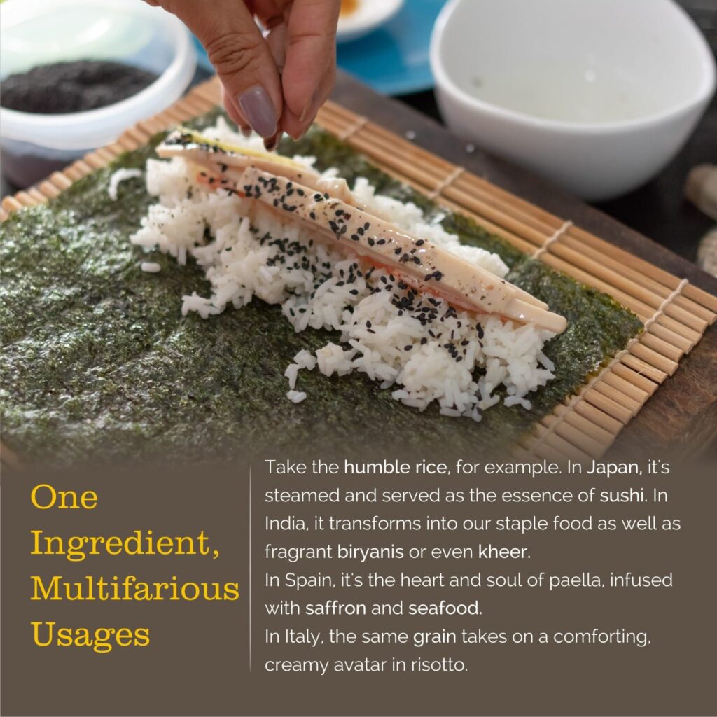Take the humble rice, for example. In Japan, it’s steamed and served as the essence of sushi. In India, it transforms into our staple food as well as fragrant biryanis or even kheer. In Spain, it’s the heart and soul of paella, infused with saffron and seafood. In Italy, the same grain takes on a comforting, creamy avatar in risotto.