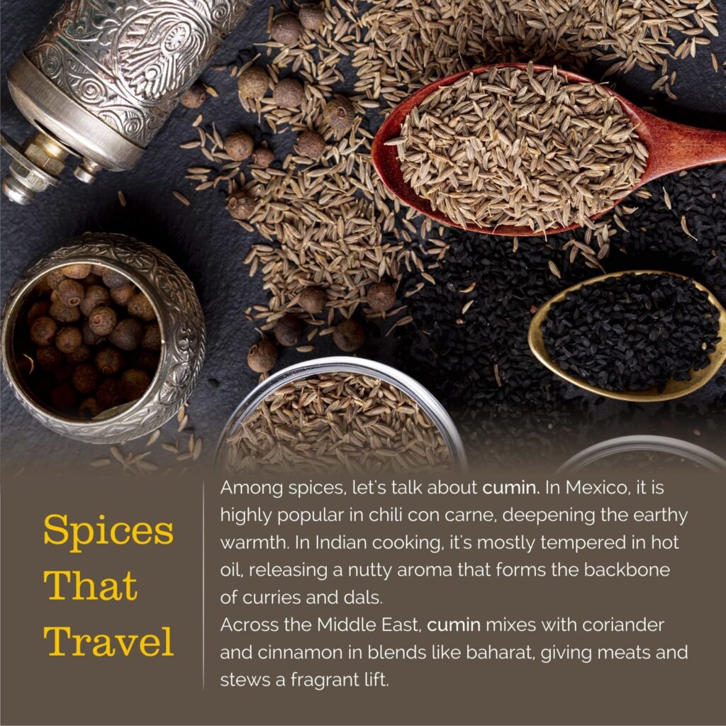 Among spices, let’s talk about cumin. In Mexico, it is highly popular in chili con carne, deepening the earthy warmth. In Indian cooking, it’s mostly tempered in hot oil, releasing a nutty aroma that forms the backbone of curries and dals. Across the Middle East, cumin mixes with coriander and cinnamon in blends like baharat, giving meats and stews a fragrant lift.
