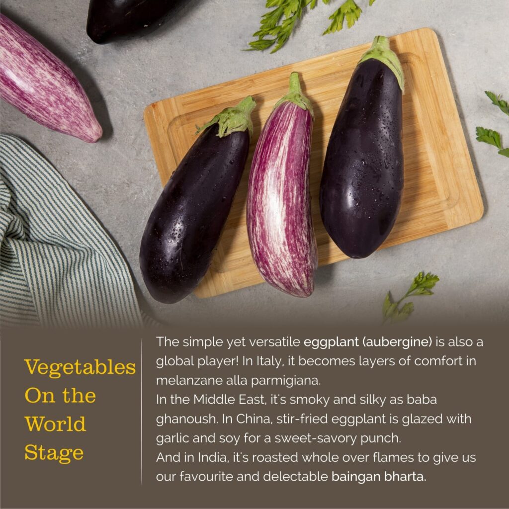 The simple yet versatile eggplant (aubergine) is also a global player! In Italy, it becomes layers of comfort in melanzane alla parmigiana. In the Middle East, it’s smoky and silky as baba ghanoush. In China, stir-fried eggplant is glazed with garlic and soy for a sweet-savory punch. And in India, it’s roasted whole over flames to give us our favourite and delectable baingan bharta.
