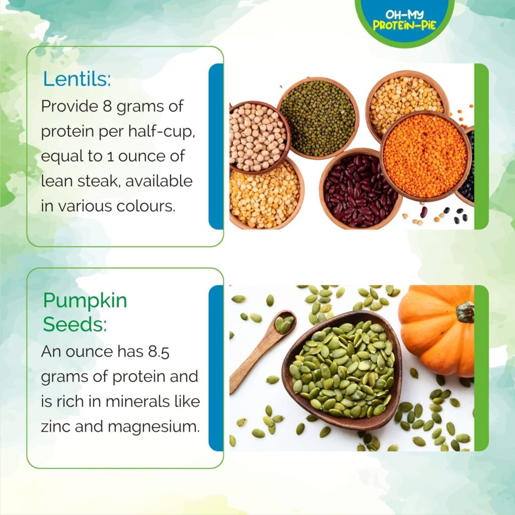 Lentils: Provide 8 grams of protein per half-cup, equal to 1 ounce of lean steak, available in various colours.