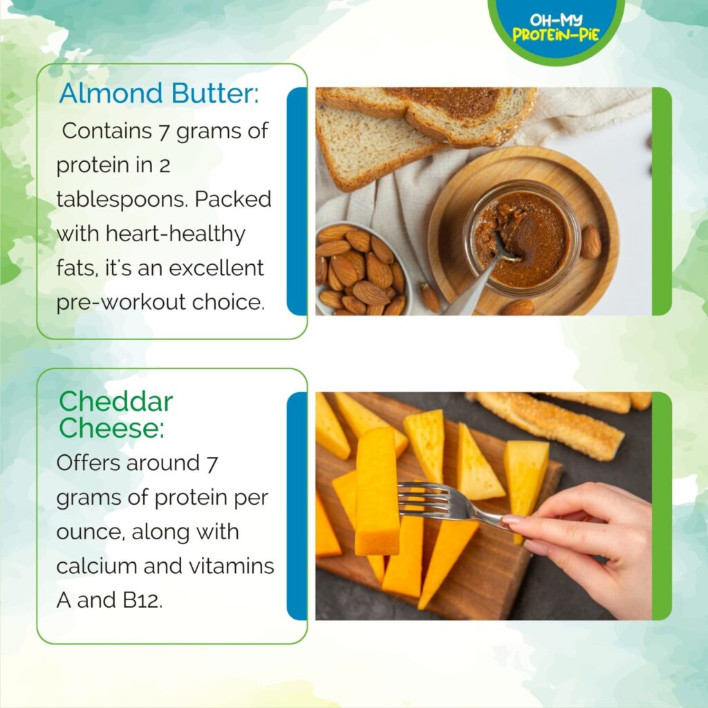Cheddar Cheese: Offers around 7 grams of protein per ounce, along with calcium and vitamins A and B12.
