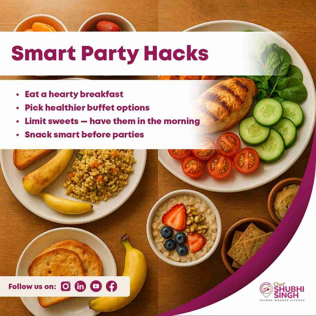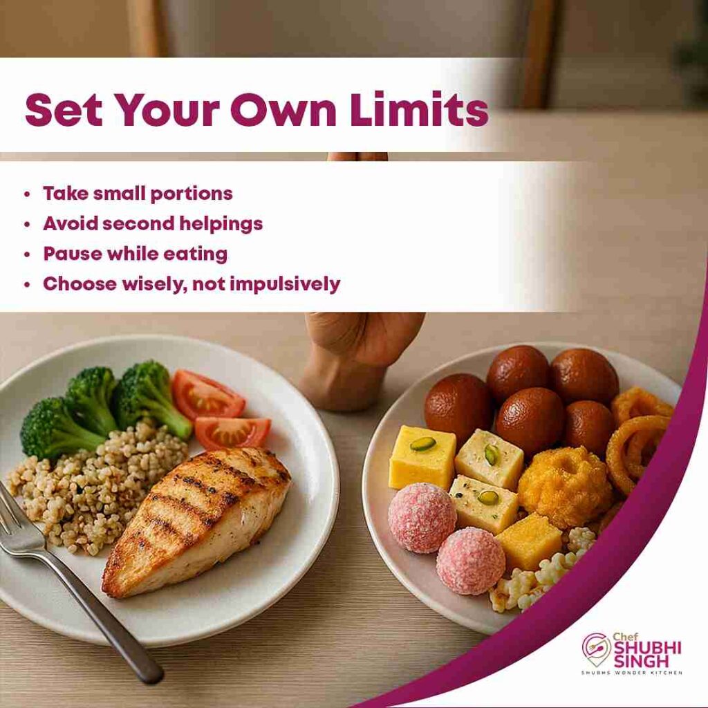 - At a buffet, always look for healthier options among the rich dishes – through this, you not only enjoy the taste by end up eating nutritious food too.