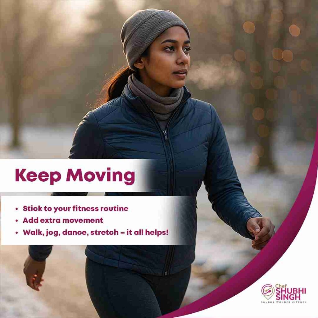 It is important to maintain your fitness routine during this season so that you do not put on those extra pounds or even fall sick owing to the hectic social life. You can indulge in whatever form of activity that you like whether it is working-out at the gym, yoga, pilates, running or simply a brisk walk which offers far more benefits than you can imagine! In fact, a little more exercise to push yourself during this season will actually help to balance out the extra calories.