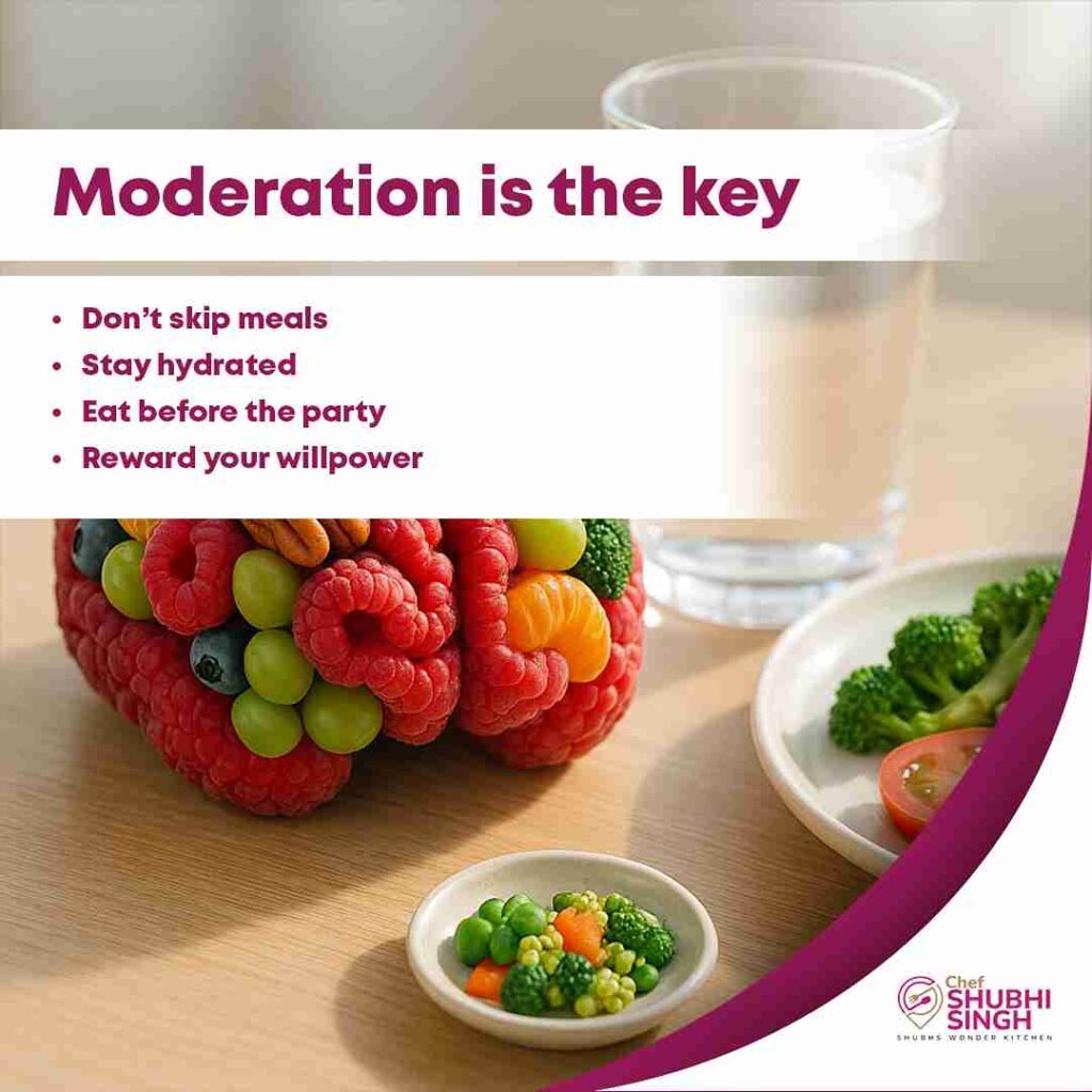 First and foremost, you need to maintain a strong will power to not over-eat or over-indulge, whether it concerns food or beverages – as they say, anything in excess is harmful! It is also imperative to stay well hydrated before any social do. Also, do not skip meals to compensate for your over-indulgence the previous night – it never works. Again, never arrive at a party on an empty stomach. And, of course, at the end of it all, reward yourself for your sustained will power to not go overboard during the fun times.