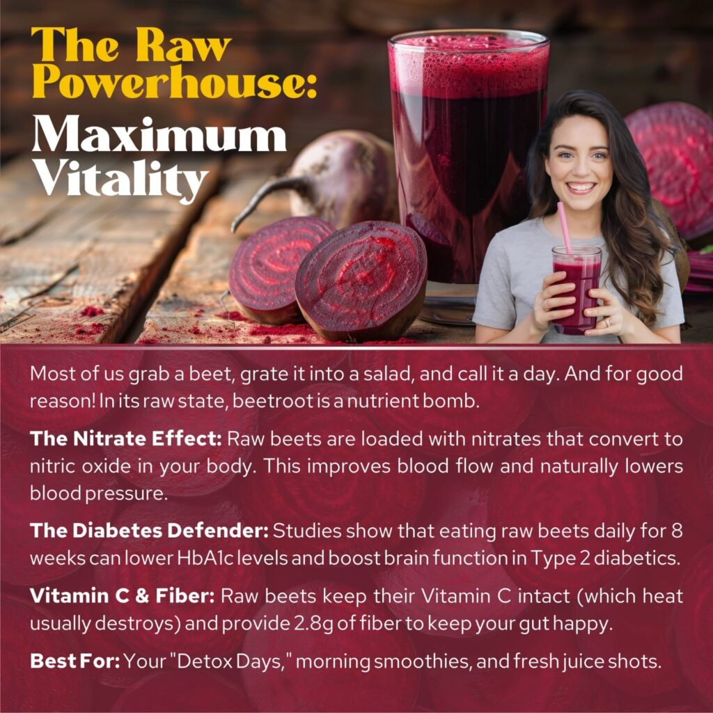 Raw beetroot is all about power. When you have it raw — in juices, salads, or smoothies — you get maximum nutrients, especially those natural nitrates that boost blood flow, energy, and that fresh, active feeling. It’s giving main-character energy, morning routine discipline, and “I have my life together” vibes.