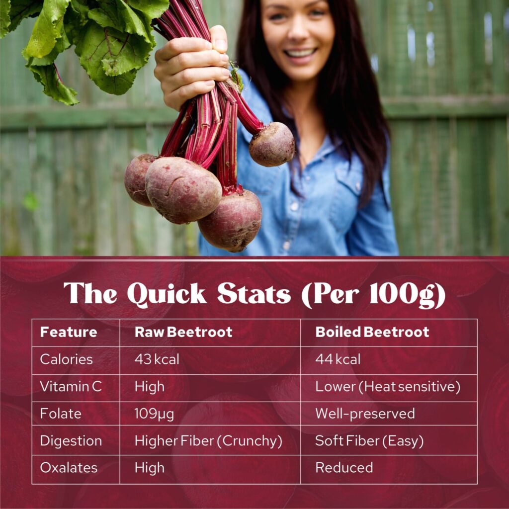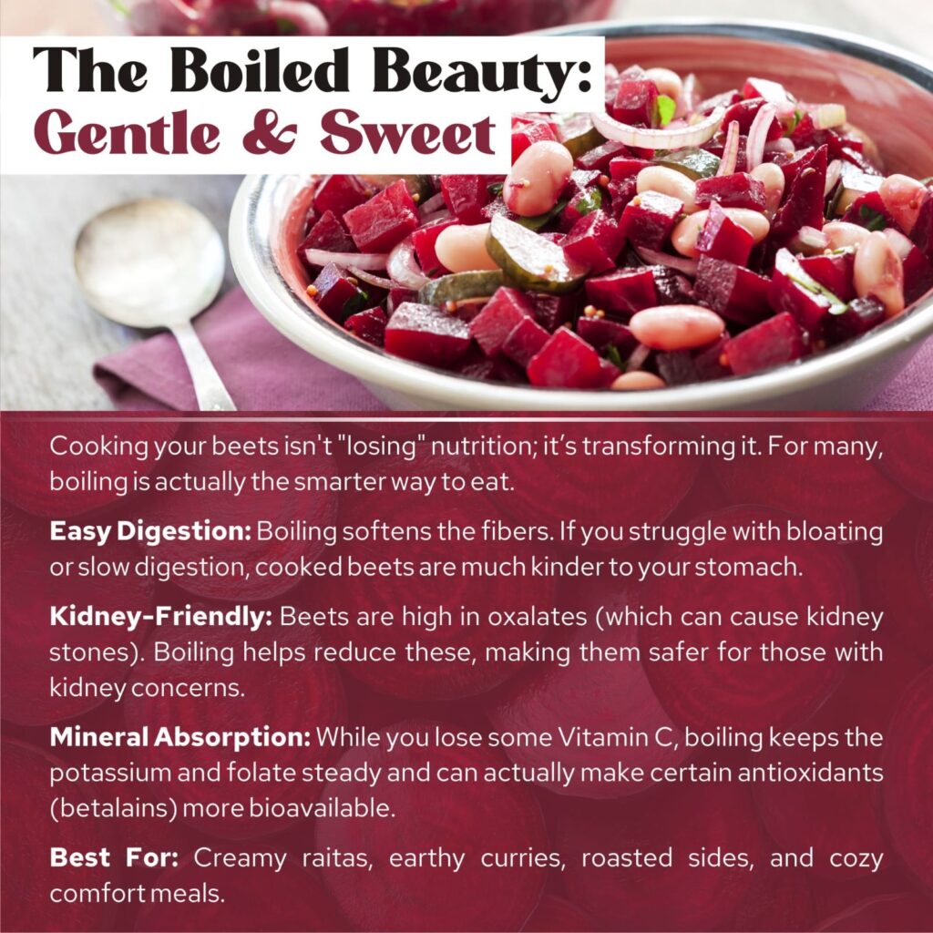 Boiled beetroot, on the other hand, turns gentle and soothing. The fiber softens for easier digestion, oxalates reduce, and key nutrients like folate remain well preserved. Plus, the antioxidants become easier for your body to absorb.