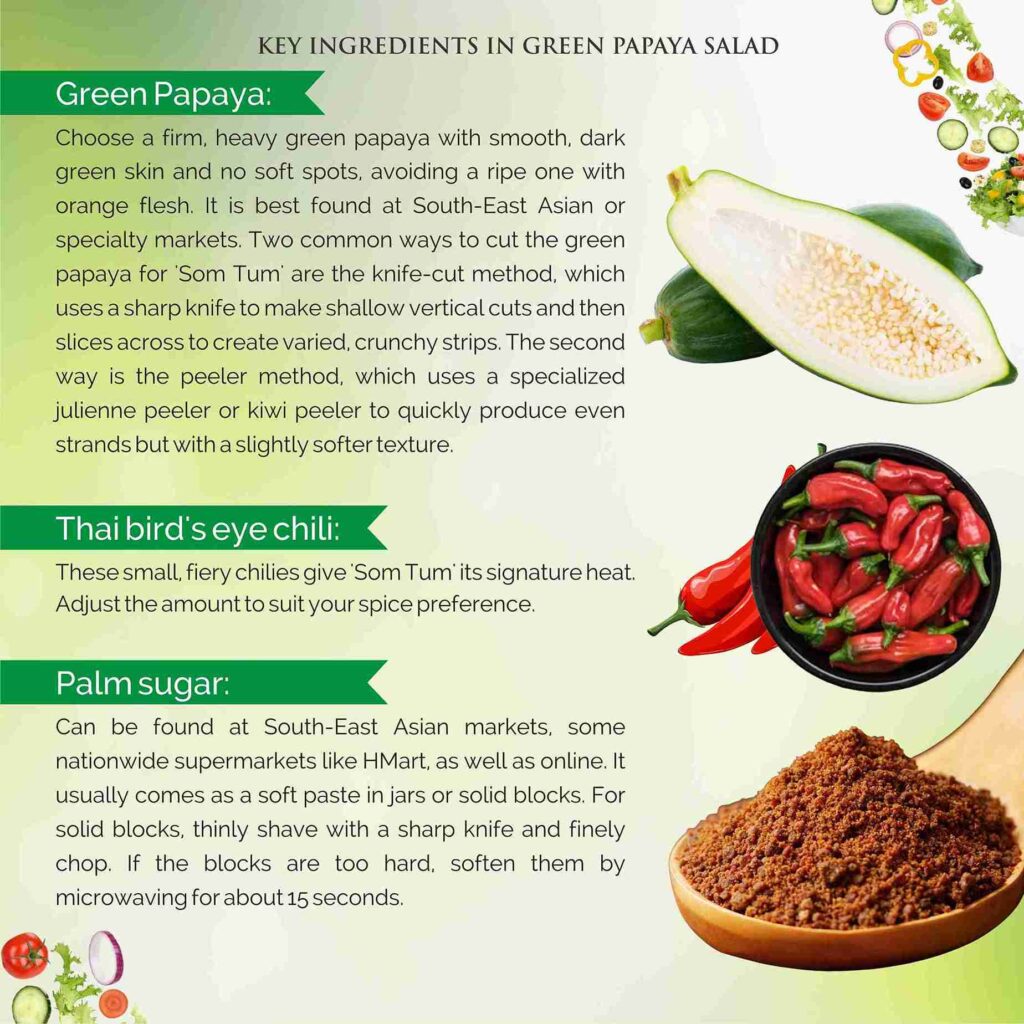 Green papaya: Choose a firm, heavy green papaya with smooth, dark green skin and no soft spots, avoiding a ripe one with orange flesh. It is best found at South-East Asian or specialty markets. Two common ways to cut the green papaya for ‘Som Tum’ are the knife-cut method, which uses a sharp knife to make shallow vertical cuts and then slices across to create varied, crunchy strips. The second way is the peeler method, which uses a specialized julienne peeler or kiwi peeler to quickly produce even strands but with a slightly softer texture.