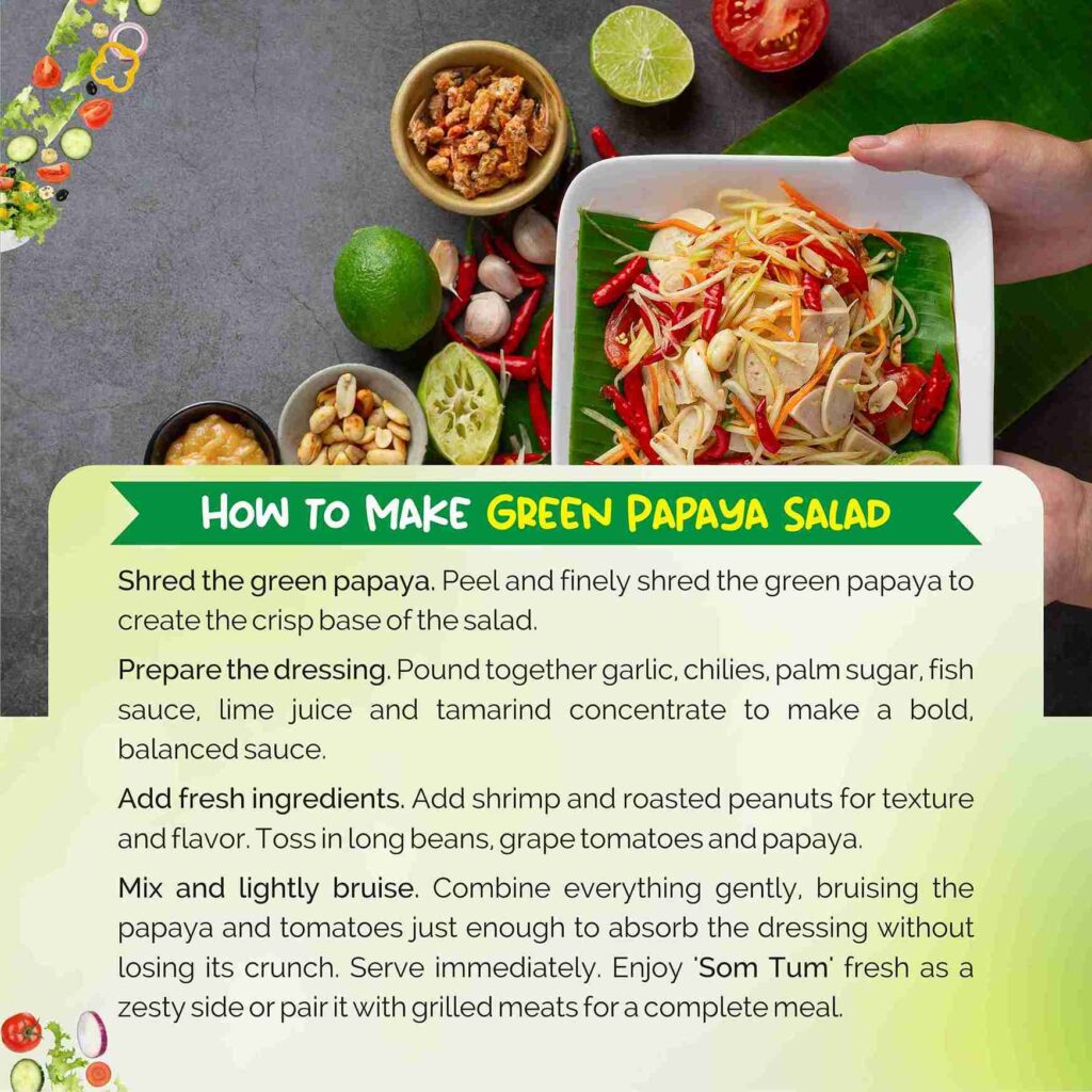 Mix and lightly bruise. Combine everything gently, bruising the papaya and tomatoes just enough to absorb the dressing without losing its crunch. Serve immediately. Enjoy ‘Som Tum’ fresh as a zesty side or pair it with grilled meats for a complete meal.