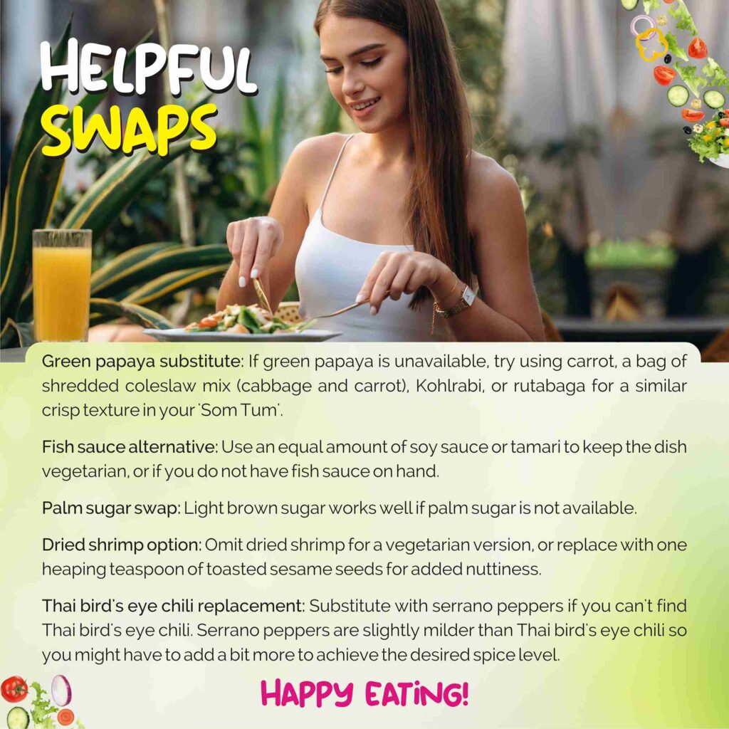 Green papaya substitute: If green papaya is unavailable, try using carrot, a bag of shredded coleslaw mix (cabbage and carrot), Kohlrabi, or rutabaga for a similar crisp texture in your ‘Som Tum’.