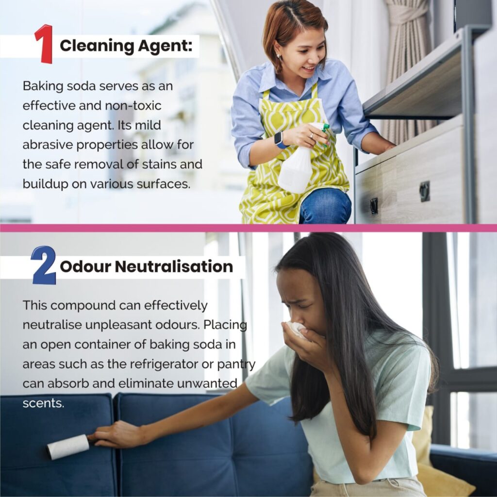 2. Odour Neutralisation: This compound can effectively neutralise unpleasant odours. Placing an open container of baking soda in areas such as the refrigerator or pantry can absorb and eliminate unwanted scents.