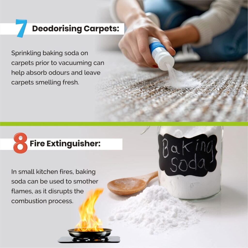 7. Deodorising Carpets: Sprinkling baking soda on carpets prior to vacuuming can help absorb odours and leave carpets smelling fresh.