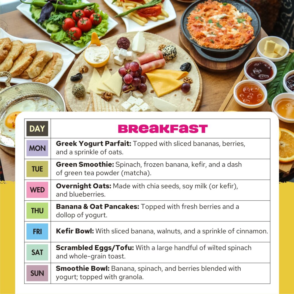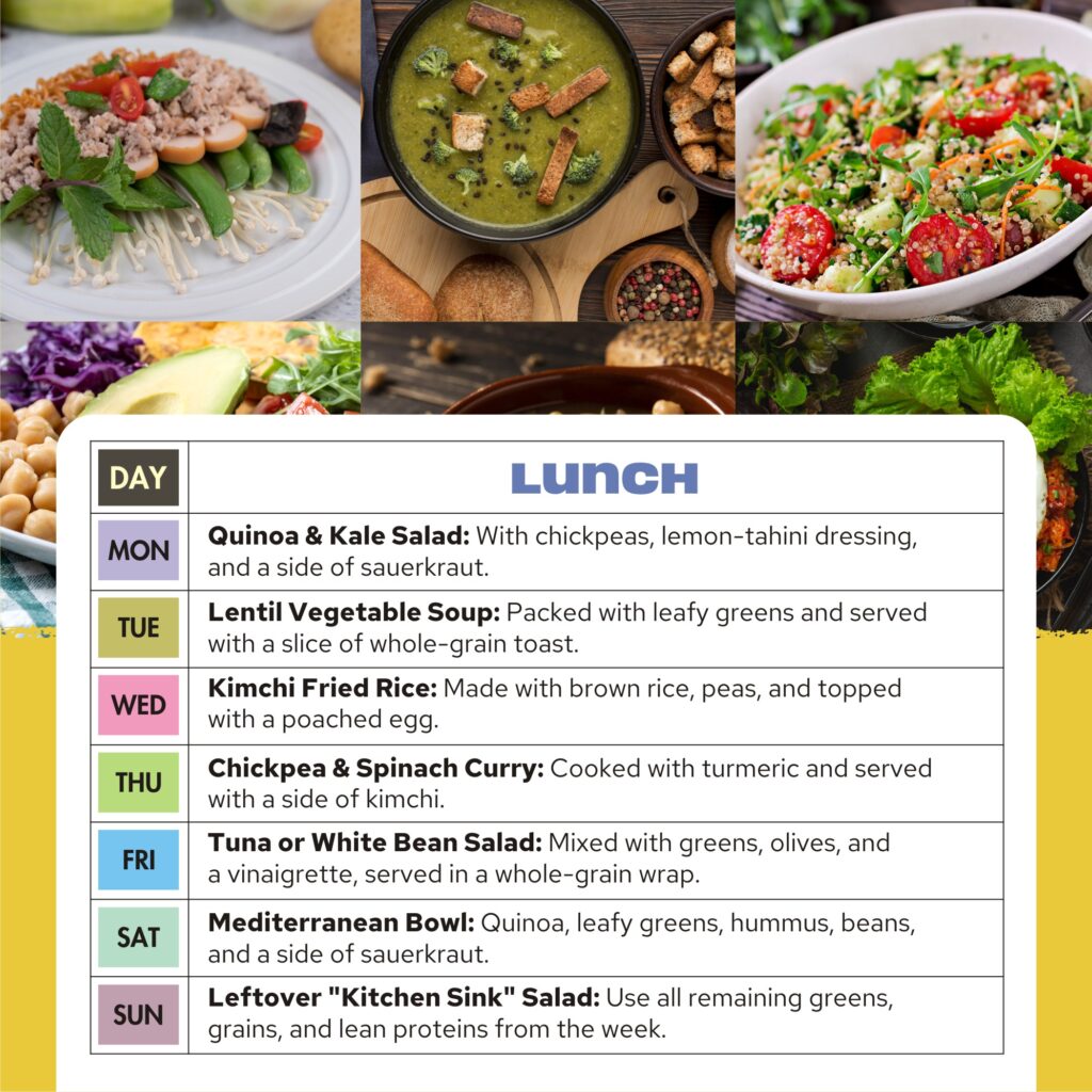 | Mon | Greek Yogurt Parfait: Topped with sliced bananas, berries, and a sprinkle of oats. | Quinoa & Kale Salad: With chickpeas, lemon-tahini dressing, and a side of sauerkraut. | Baked Salmon: Served with steamed broccoli and a small portion of brown rice. |