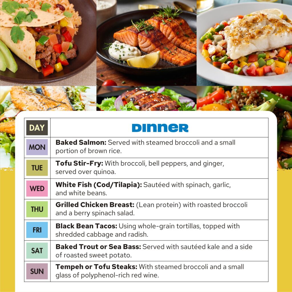 | Sun | Smoothie Bowl: Banana, spinach, and berries blended with yogurt; topped with granola. | Leftover “Kitchen Sink” Salad: Use all remaining greens, grains, and lean proteins from the week. | Tempeh or Tofu Steaks: With steamed broccoli and a small glass of polyphenol-rich red wine. |