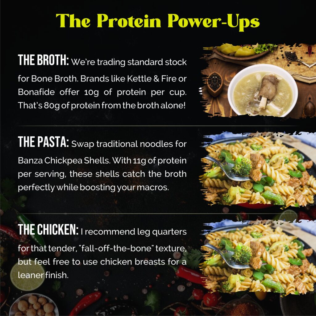 • The Broth: We’re trading standard stock for Bone Broth. Brands like Kettle & Fire or Bonafide offer 10g of protein per cup. That’s 80g of protein from the broth alone!